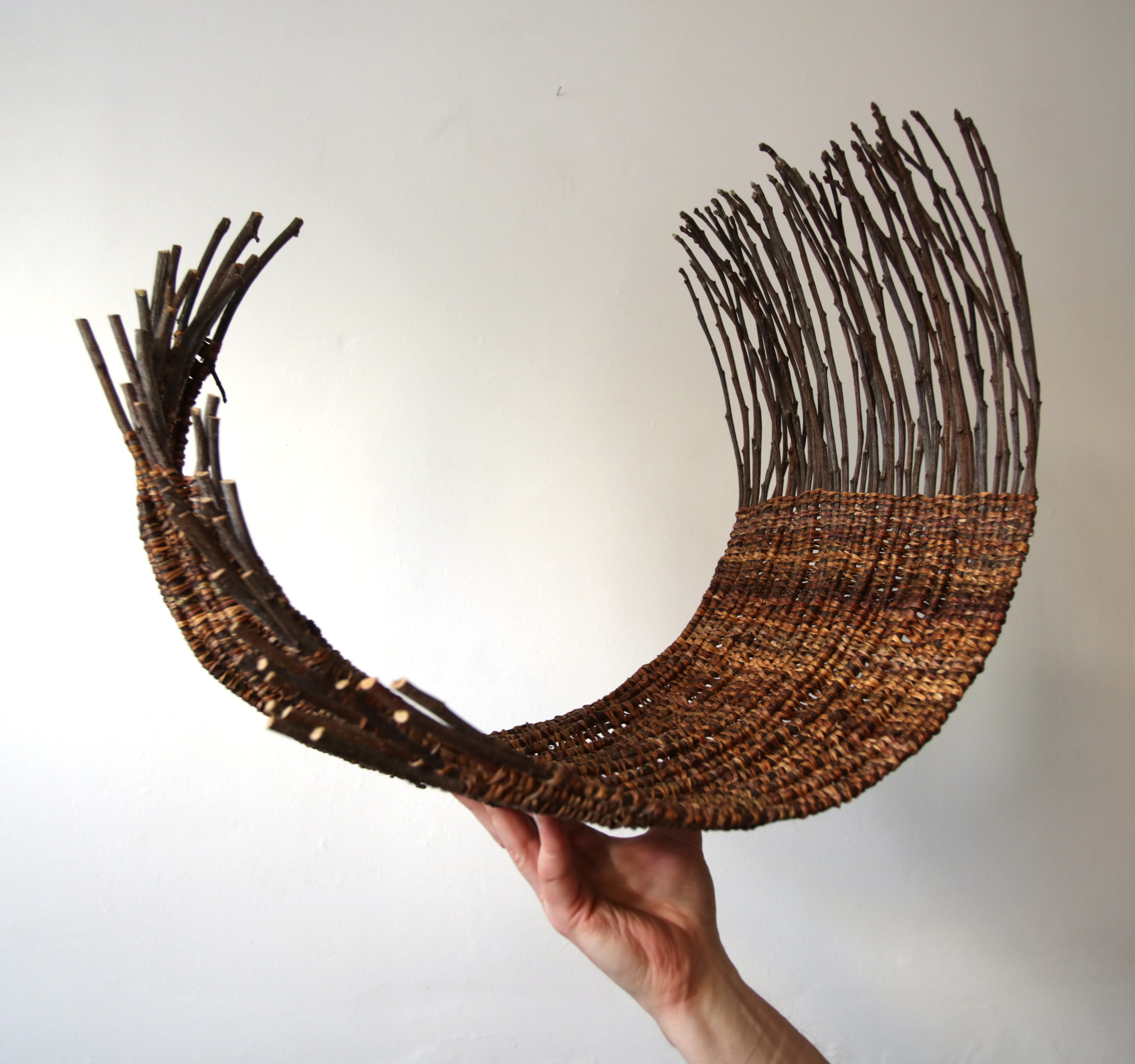 In the studio over the last couple of weeks, I’ve been working on another piece in my apple wood and bindweed Arc series. This is the largest so far and really makes the most of those curled, dried apple prunings that take on the form of the metal barrel in which they are put to dry – shown in my last post. This piece makes use of the previous winter’s prunings, while the recent batch start to slowly dry. The new Arc is now at Gallery 57, in Arundel, ready for the forthcoming show TEN, which opens on 11th April. Arc iv accompanies the set of four daffodil weave pieces I made last summer (and wrote about in July’s post), during a concentrated period of working with daffodil leaves and stems.