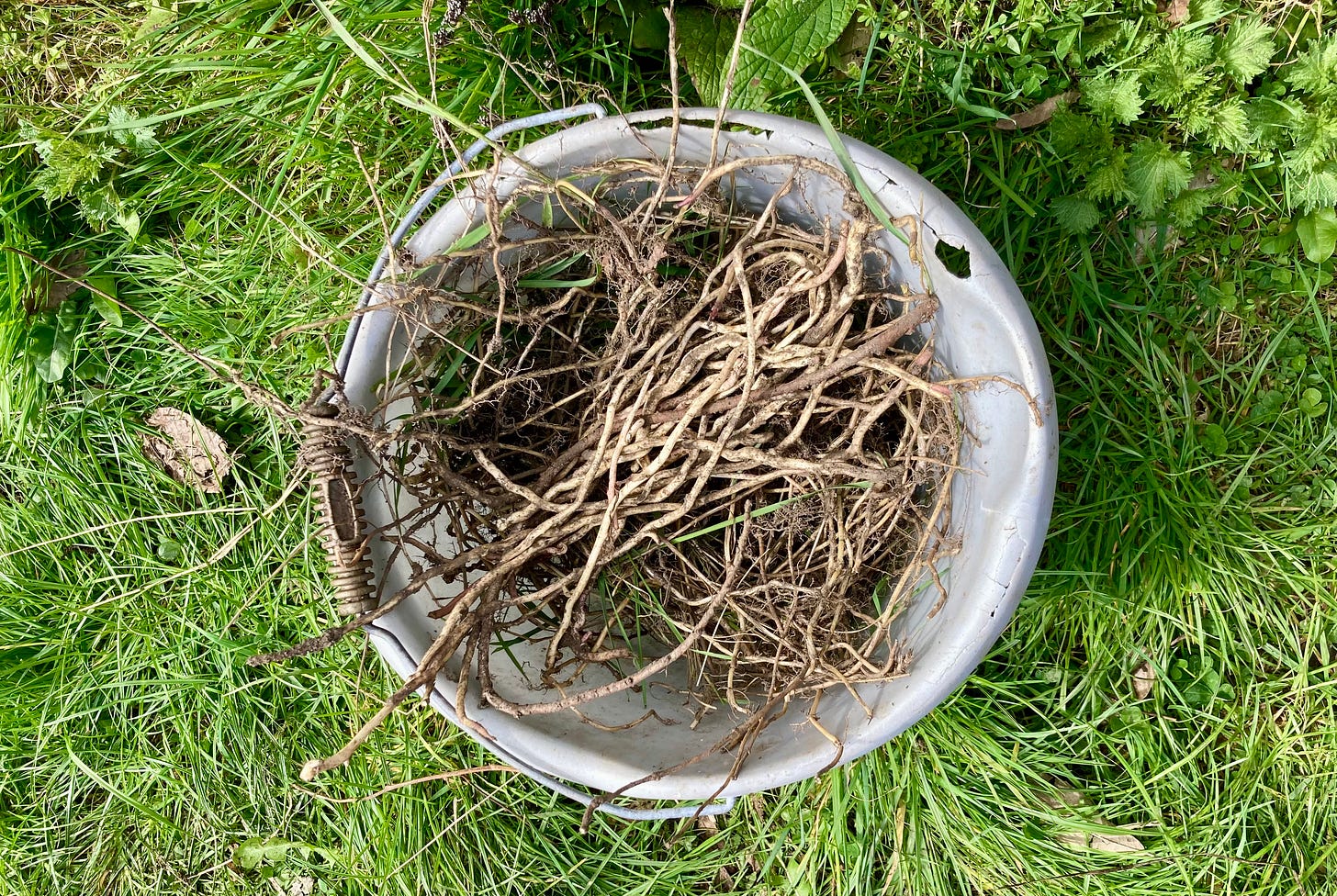 The roots have such different characteristics, and I started thinking about their potential as a material to work with. I know I wrote a little about digging up roots back in December, when I was clearing roots from another of the growing beds. This is the curse (or the magic) of what I do – I can’t just clear an area and simply chuck all the resulting debris on the waste pile. I end up sorting through the roots and putting aside a bucket of the ones that hold the most potential. Maybe they won’t behave as I expect, once they’re dried. But I will have a play with them and see if I can work with them in some way. They are currently soaking in a bucket in the bathroom with the aim of cleaning the rest of the soil off.